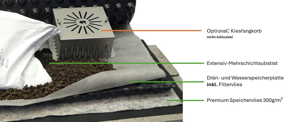 Auf den Untergrund, z. B. Holz, Beton oder Bitumen, wird eine vollflächige Wurzelschutzbahn ausgelegt. Dafür eignen sich unsere EPDM-Dachfolien ideal, die laut Forschungsgesellschaft Landschaftsentwicklung Landschaftsbau e. V. (FLL) als „wurzelfest” gelten. Darauf folgt unser hochwertiger Trenn-, Schutz- und Speichervlies.